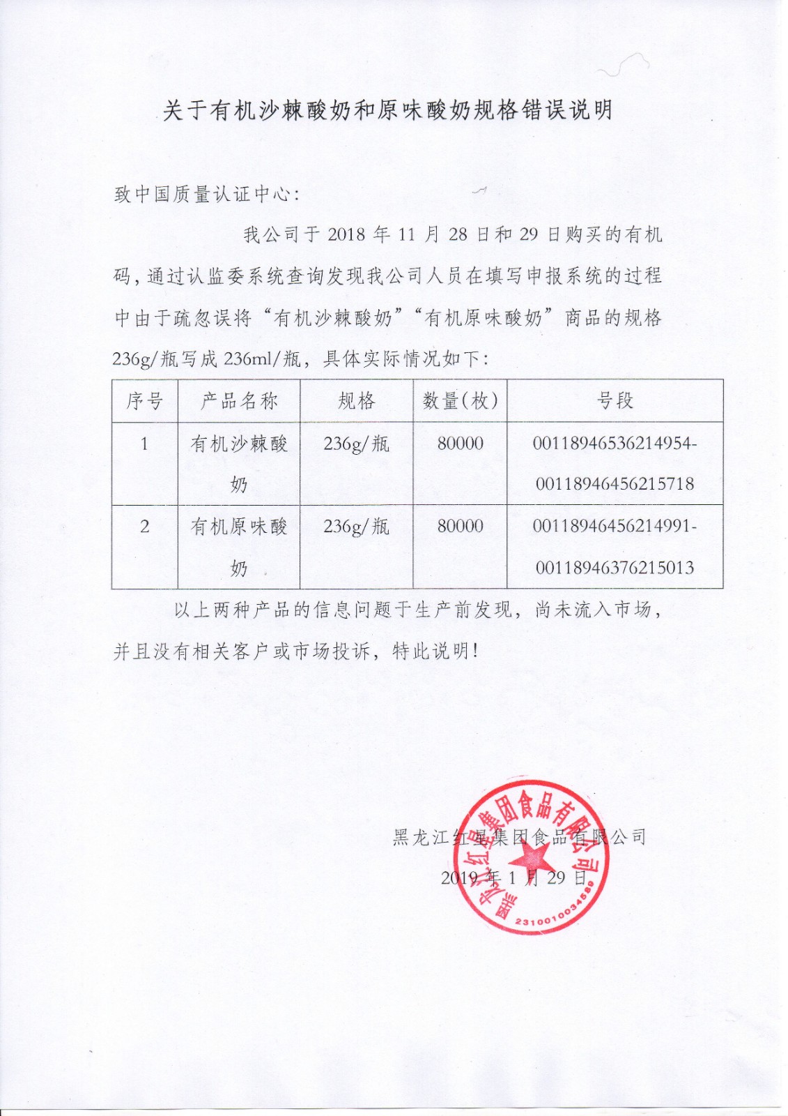 關(guān)于有機(jī)沙棘酸奶和原味酸奶規(guī)格錯(cuò)誤說(shuō)明